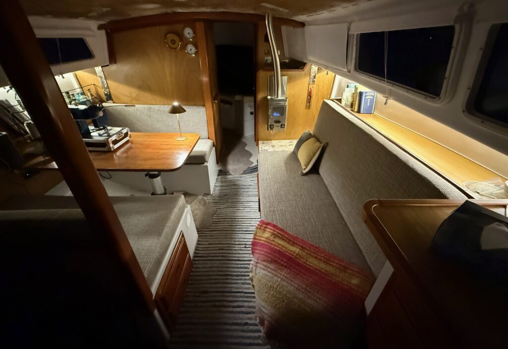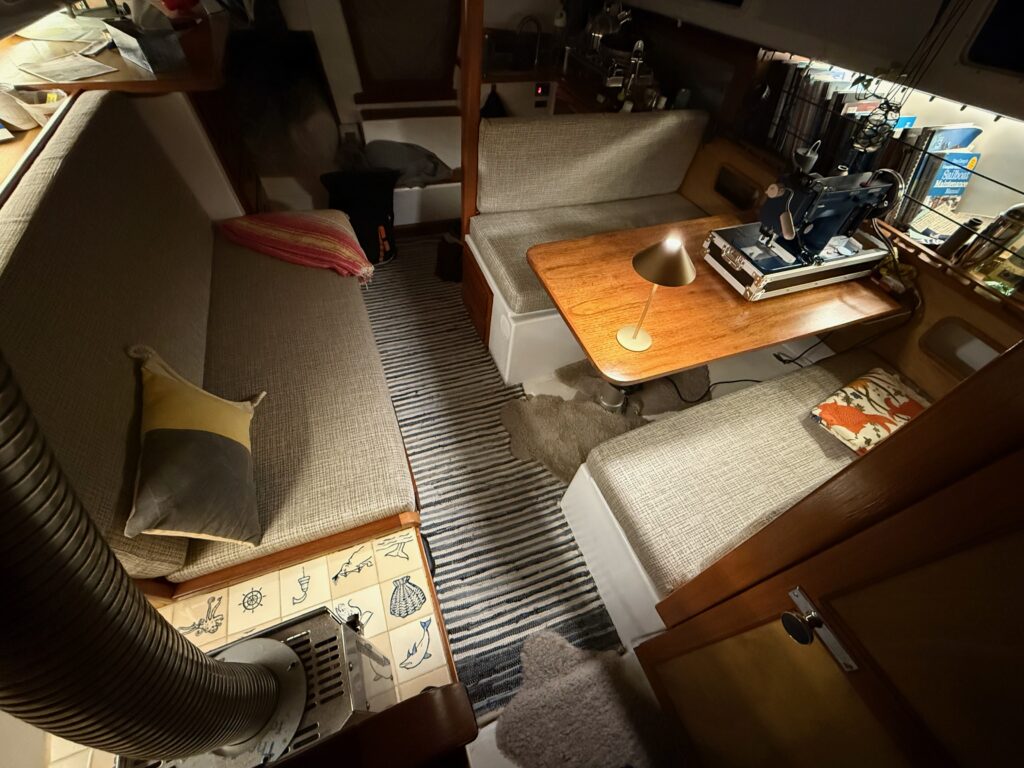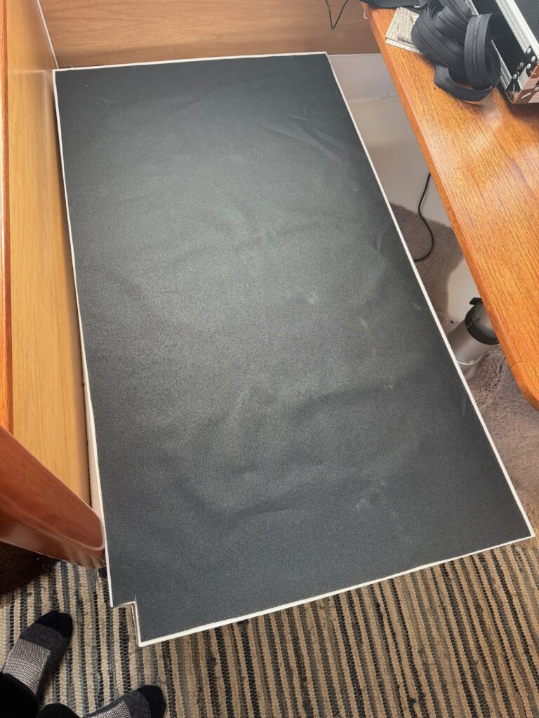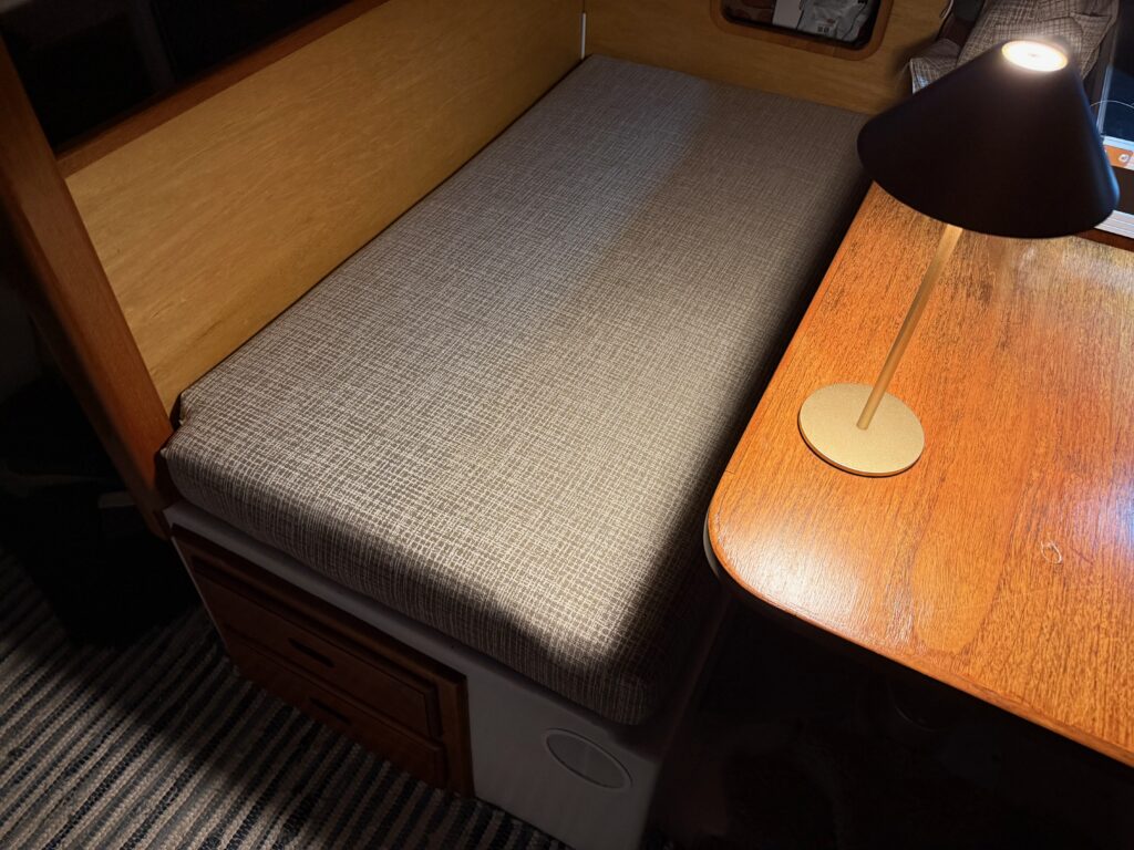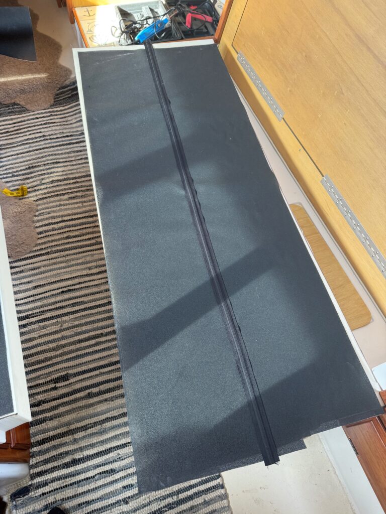 Made one of the cushions for the v-birth today. Ended up being a bit more complex with curve+bevel in one side but turned out OK. Man, the boat doesn’t have much space for this type of work – cushion + roll of material + measuring tools and so for. Spent a lot of time crunched up in tight places.