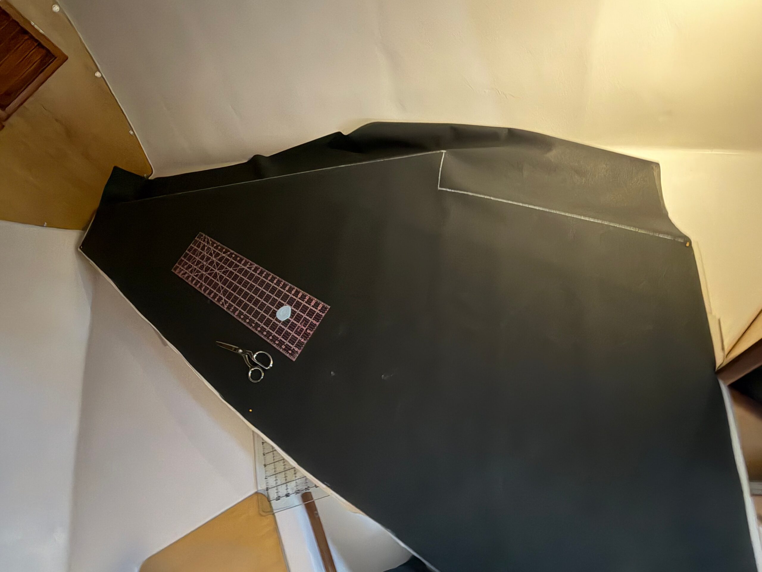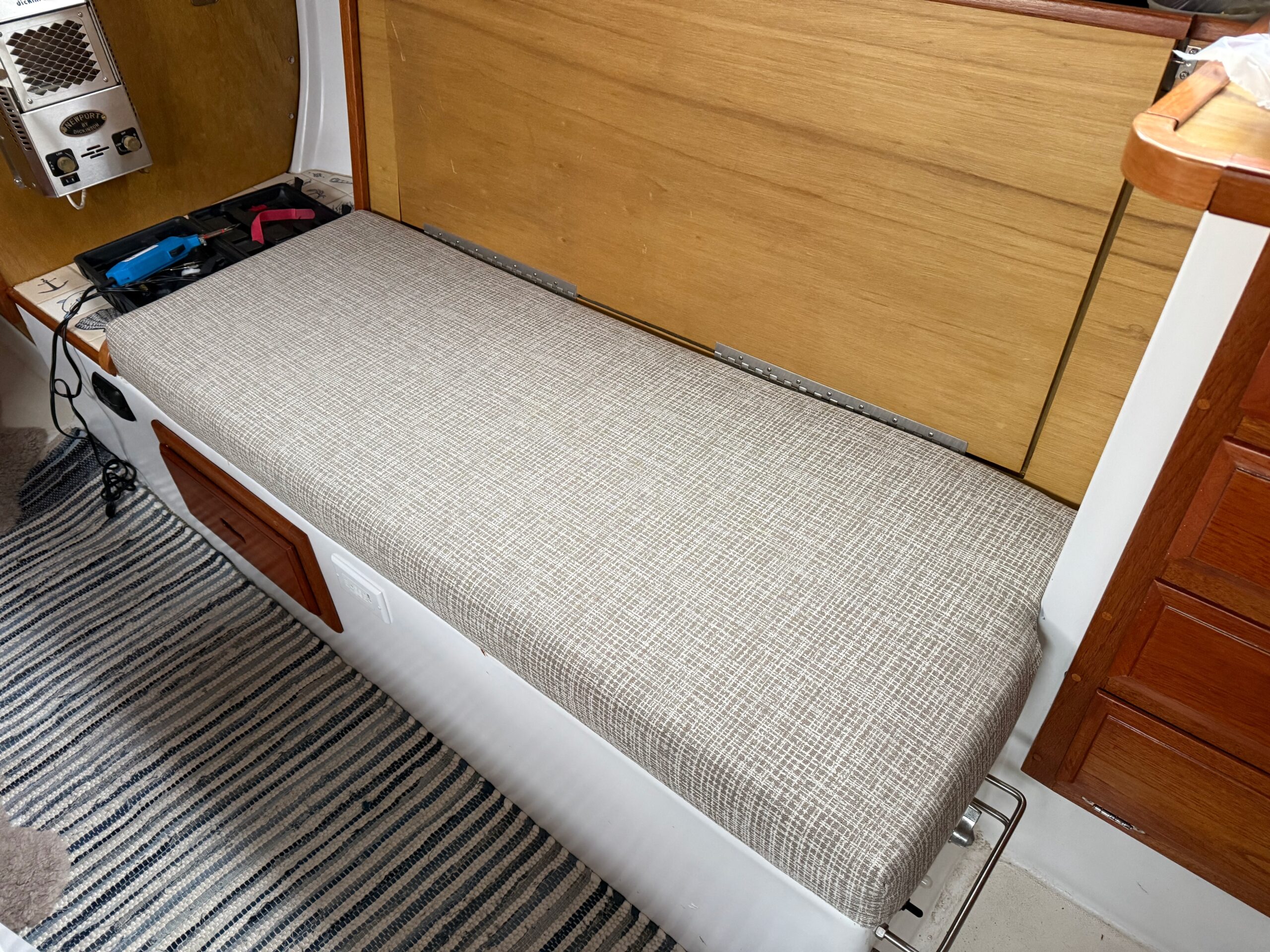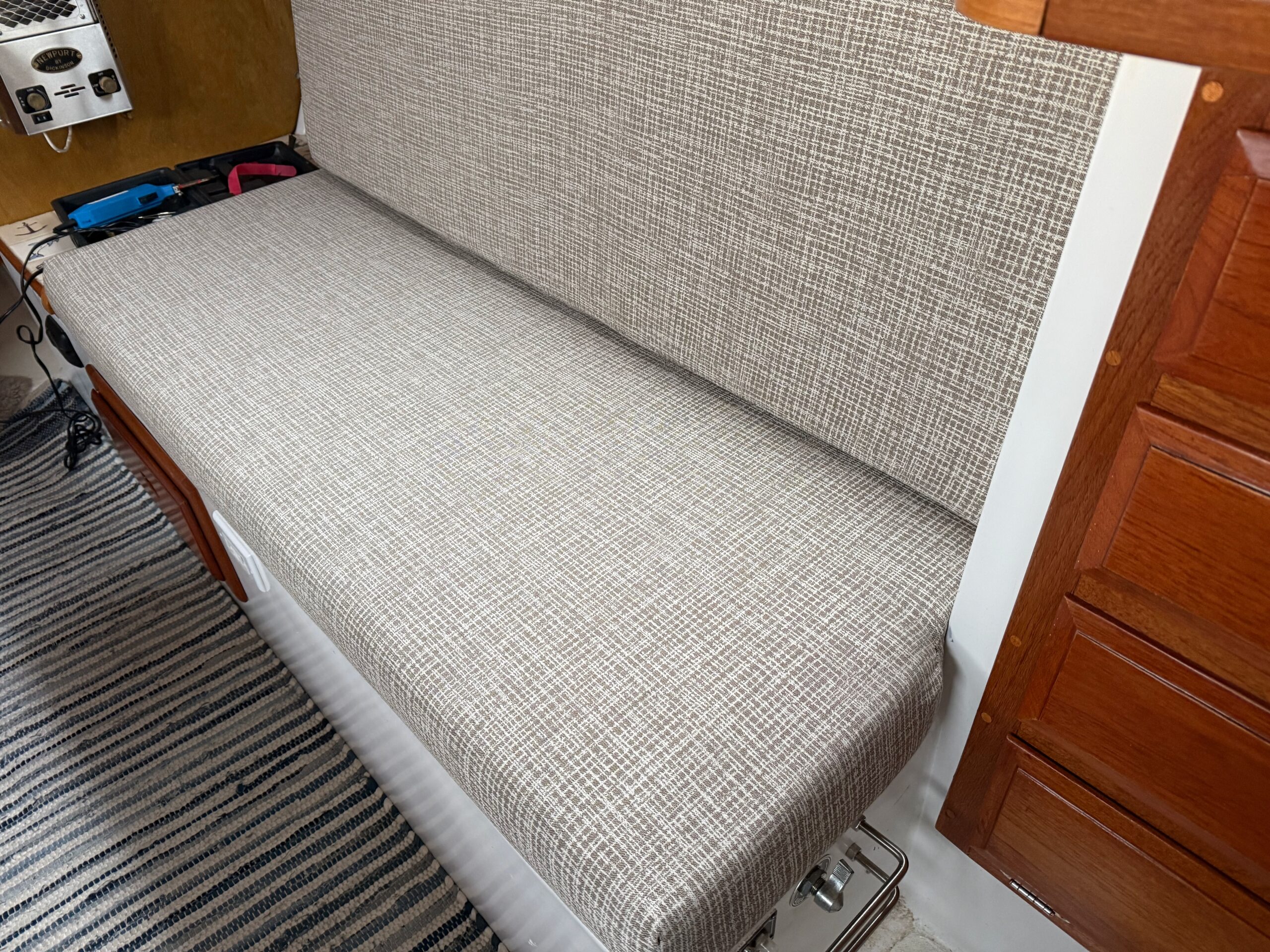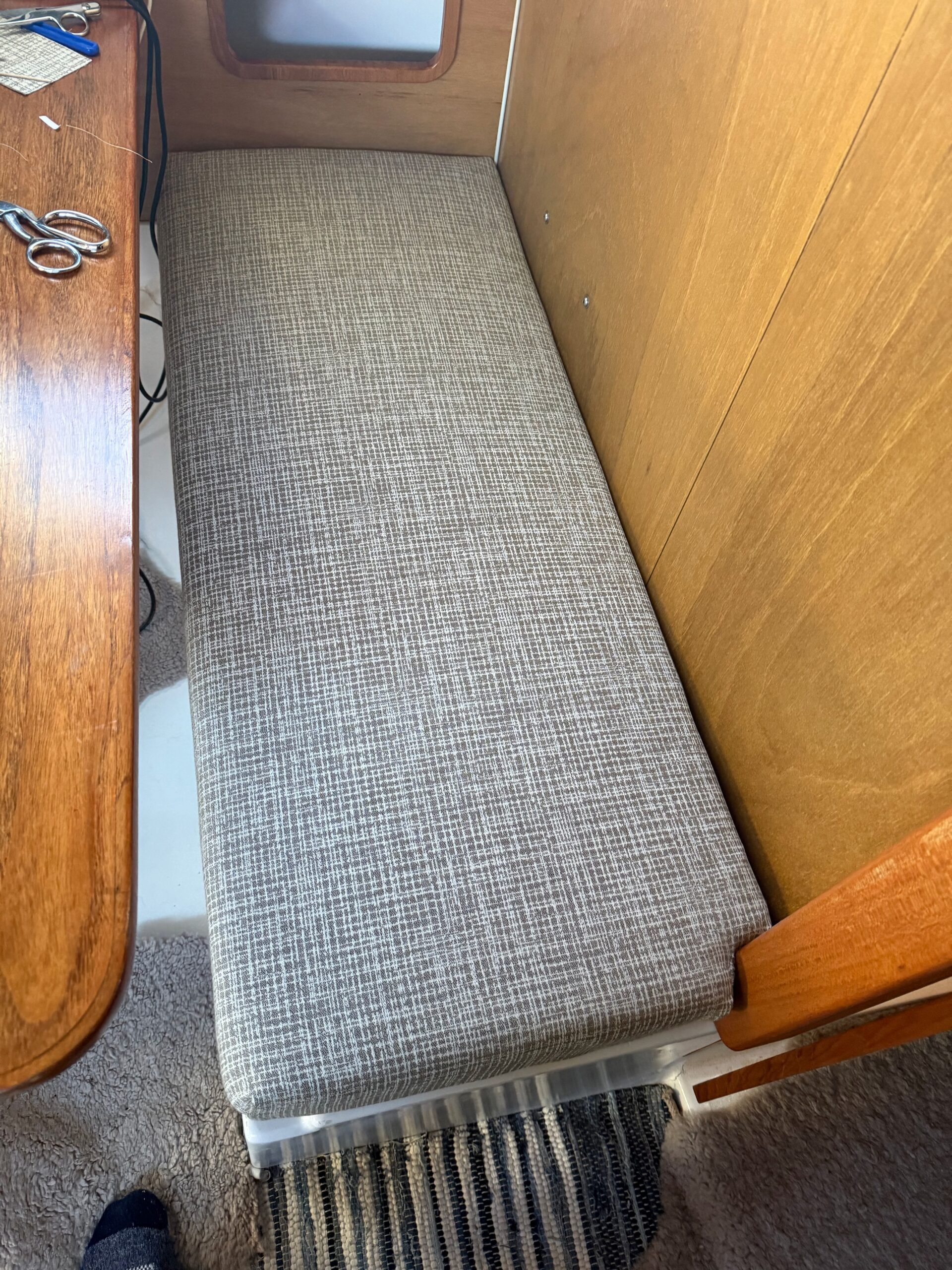 Made one of the cushions for the v-birth today. Ended up being a bit more complex with curve+bevel in one side but turned out OK. Man, the boat doesn’t have much space for this type of work – cushion + roll of material + measuring tools and so for. Spent a lot of time crunched up in tight places.