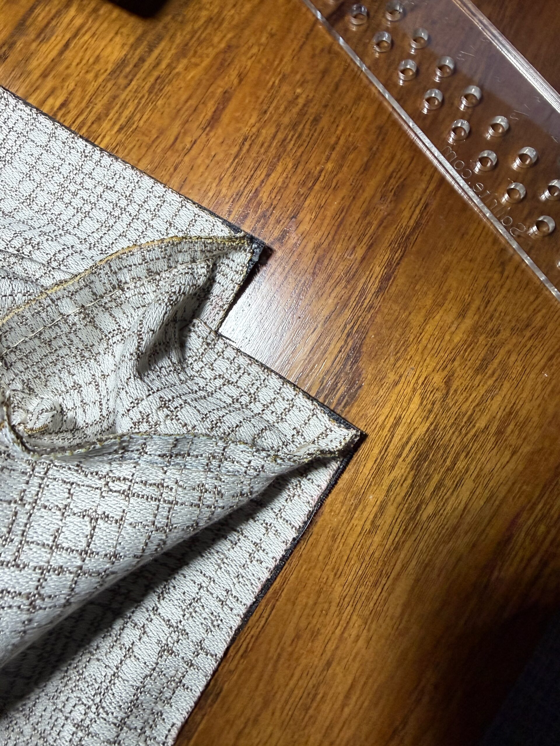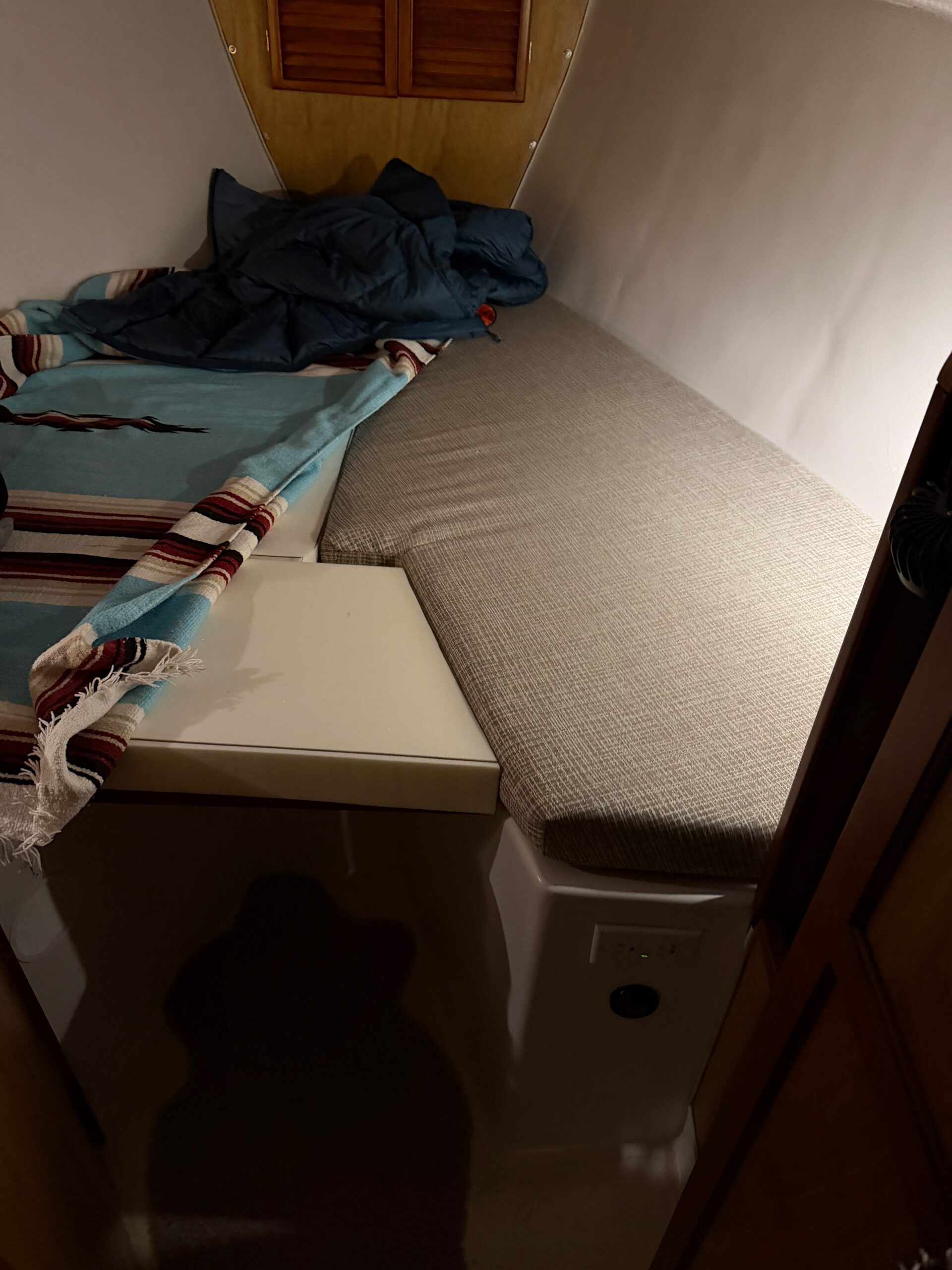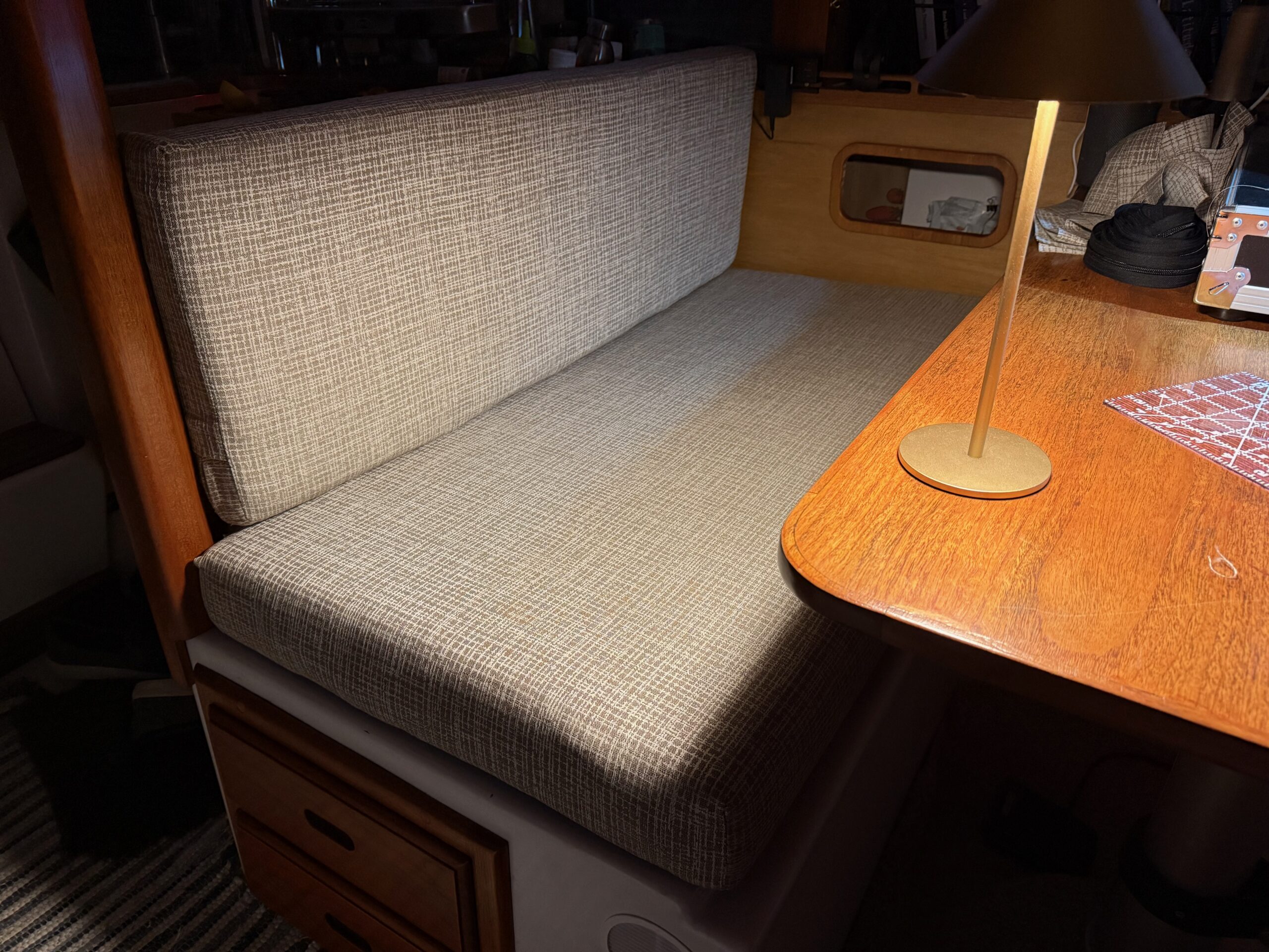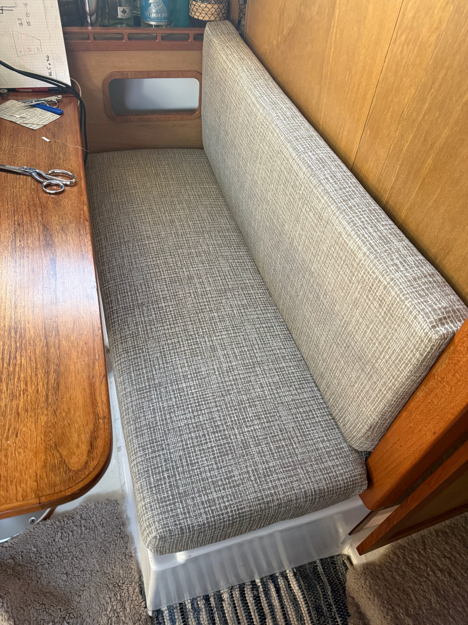 Made one of the cushions for the v-birth today. Ended up being a bit more complex with curve+bevel in one side but turned out OK. Man, the boat doesn’t have much space for this type of work – cushion + roll of material + measuring tools and so for. Spent a lot of time crunched up in tight places.